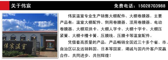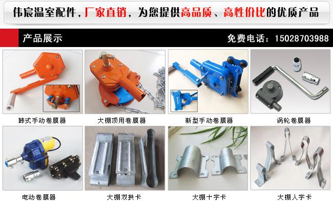 泊头市伟宸温室设施制造有限公司,**生产销售大棚配件、大棚卷膜器。主要产品有:温室大棚配件、侧用卷膜器、顶用卷膜器、电动卷膜器、大棚双拱卡、大棚人字卡、大棚十字卡、大棚压紧簧、大棚卡槽卡簧、压膜线、压膜卡等温室配件。